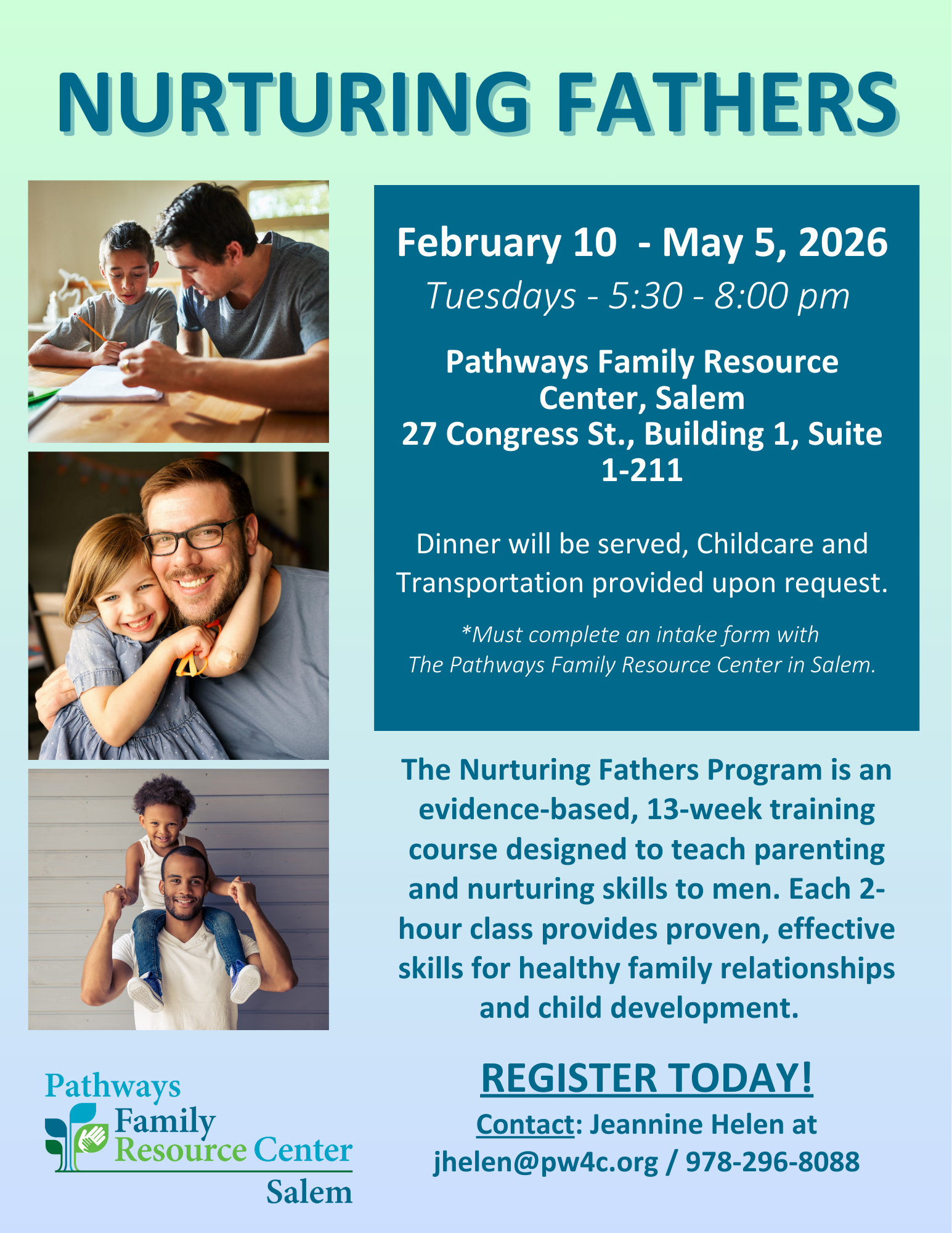 Welcome to the Pathways Family Resource Center in Salem. We serve as a partner to help parents and children wishing to access a complete range of resources. We are part of a statewide network of community-based providers offering multicultural parenting programs, support groups, information and referral resources, and education for families whose children range in age from birth to 18 years of age.