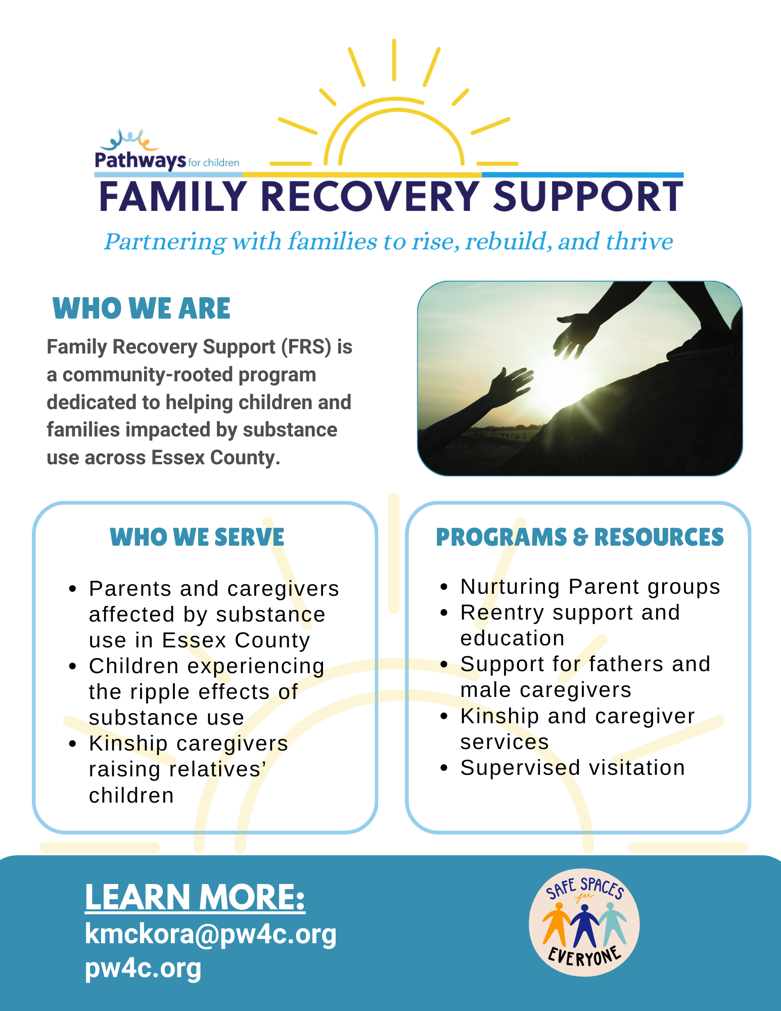 Family Recovery Support (FRS) is a community‑rooted program dedicated to helping children and families impacted by substance use across Essex County. We believe that every family deserves the opportunity to rise, rebuild, and thrive—and that strong communities play a vital role in that journey.